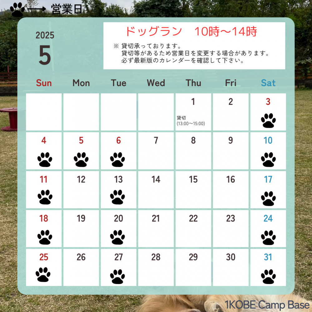 マークが営業日です🐶10時から14時となります🍀営業日は変更することがあります。変更のある場合は、Instagram、HP等でお知らせしていますので必ず最新の情報をご確認下さい。貸切予約も受付中です😉貸切の場合はプールもご用意できます!